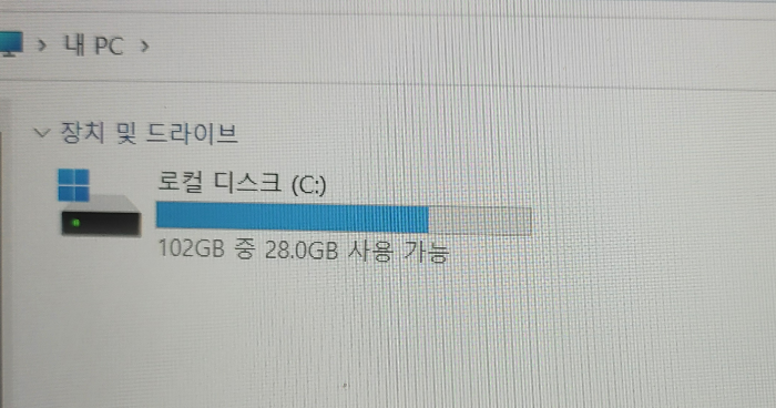하드 용량 중요하겠죠. 하드용량을 확인해보니 SSD 128GB라고 사양에 되어 있는데 실제 컴퓨터를 열어서 C드라이브를 확인해보니 용량이 100기가 정도 되더라구요.