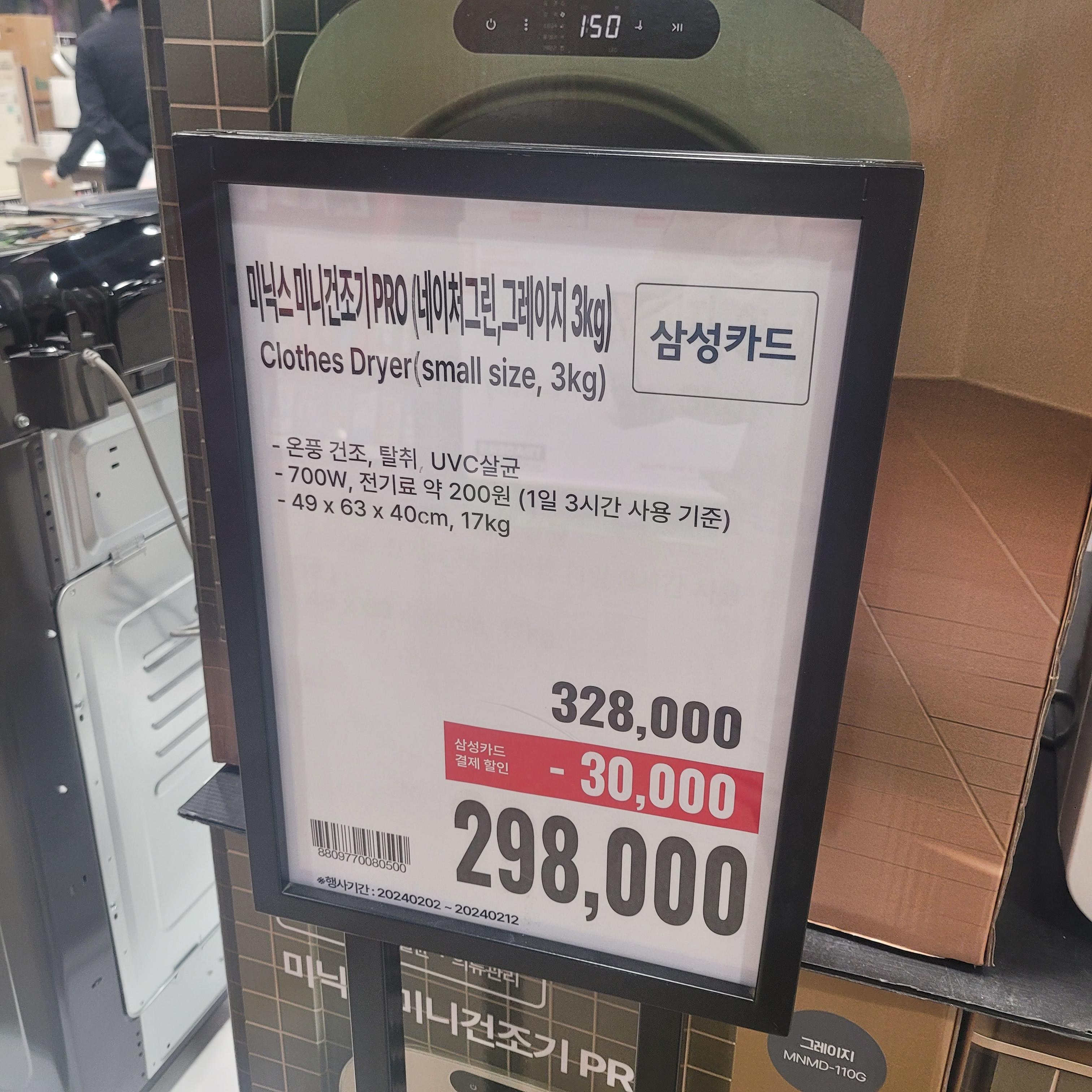 일단 제가 이마트트레이더스에서 봤던 미닉스 미니건조기는 32만8천원 정도였습니다. 삼성카드로 결제하면 3만원 할인이 있었구요.