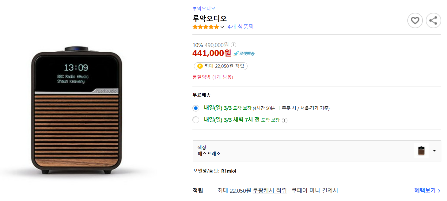 혹시나 해서 쿠팡에 찾아보니 박람회장에서 사는 것보다도 훨씬 저렴했습니다. ㅎㅎ 루악오디오 R1 제품 기준으로 봤을 때 정가가 49만원이었고, 쿠팡은 10% 할인된 44만1천원에 나와 있었습니다.