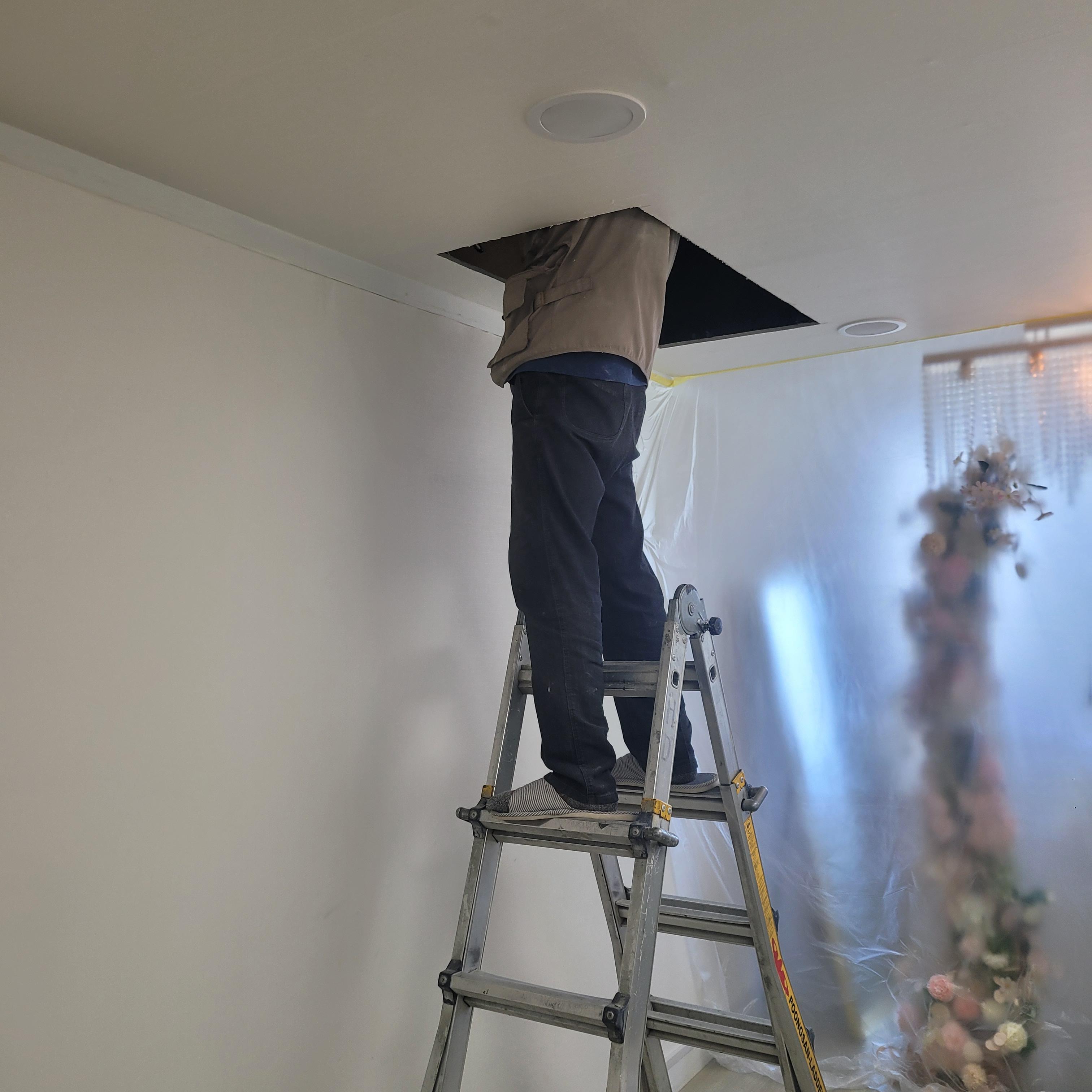 최근에 천장형 에어컨 설치 및 도배 인테리어를 최근에 한 적이 있는데요. 앙카 설치, 조명을 빼는 작업을 할 때 이런 높이가 굉장히 높은 사다리를 가지고 작업을 합니다.